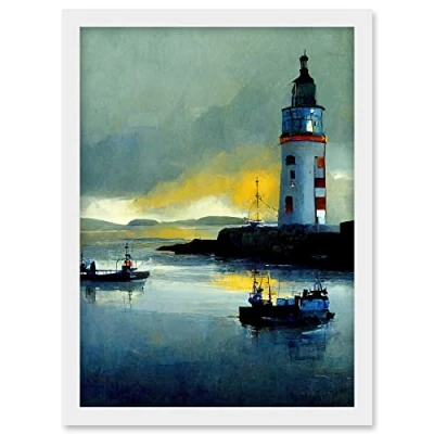 Doppelganger33 LTD Scottish Harbour Fishing Boats Lighthouse Modern Artwork Framed A3 Wall Art Print