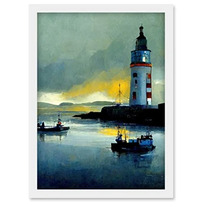 Doppelganger33 LTD Scottish Harbour Fishing Boats Lighthouse Modern Artwork Framed Wall Art Print A4