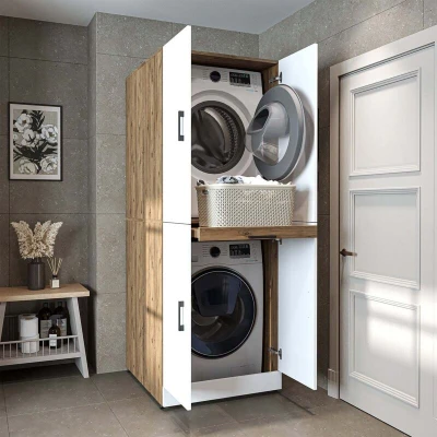 Dora Washer and Dryer Stacker Cabinet with Double Doors Pull Out Basket Shelf, Oak Effect White