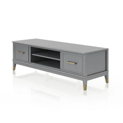 Add a trendy focal point to your living room with the CosmoLiving by Cosmopolitan Westerleigh TV Stand for TVs up to 65” wide The 2 doors and fixed center shelf offers open and concealed storage for your entertainment accessories Clean white, edgy dark gray, or matte black finish with gold accents adds a sophisticated touch to your space Made of painted MDF and wood for a sturdy build without the high price tag