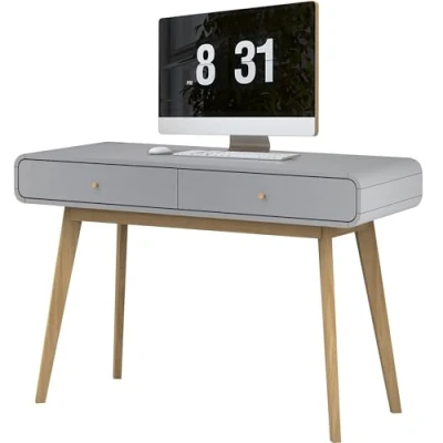 2 drawers on metal rails Tapered legs Curvy desk top Made of easy-care MDF Easy assembly.
