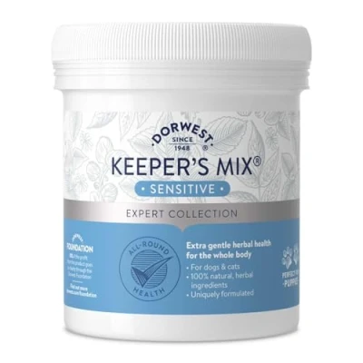 SENSITIVE DIET SUPPLEMENT FOR DOGS & CATS: super-boost your pet’s diet with Dorwest Keeper's Mix Sensitive, a unique blend of seven herbs that provides gentle nutritional support for young cats and dogs, or those with known sensitivities GENTLY SUPPORTS ALL-ROUND HEALTH: Keeper's Mix Sensitive naturally promotes all-round health, supporting vital organs in your dog’s or cat’s body, as well as encouraging a thick and healthy coat 100% HERBAL INGREDIENTS: the blend of seven herbs are perfectly balanced to provide natural antioxidants (to neutralise free radicals), vitamins, minerals, chlorophyll, fibres and complex bioactive compounds while being especially gentle on the gut and other organs SUITABLE FOR RAW DIETS: for dogs on raw diets, Dorwest Keeper's Mix is a popular choice, with 100% herbal ingredients and nothing artificial – just pure, natural goodness 70 YEARS OF HERBAL PET CARE: we’ve been supporting pets’ health care since 1948 – our constant focus on quality is one of many reasons why our herbal supplements and tablets are trusted by pet owners and veterinary professionals worldwide