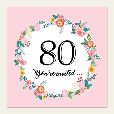 BEAUTIFUL DESIGN This bright design will be loved by anyone who receives it! This design is available in a broad range of ages, with a cute floral garland surrounding the words '80 You're invited...' HIGH-QUALITY AND AFFORDABLE: These 145 x 145 mm cards are printed on top quality card stock. The bright colours stand out against the 350 gsm white matte card, making these invitations super eye-catching! They come complete with thick white envelopes, meaning they're also so easy to send to all your guests. MADE WITH LOVE IN THE UK: Here at dotty about paper, our stationery is designed, printed, and hand-packed with love in the UK! This design is completely unique to dotty about paper, meaning you won't be able to find it anywhere else! All of our customer service is also handled in house in the UK - we are always happy to help! We are also investing in programs to help us be kinder to the environment. SUPER FUNCIONAL: These cards have plenty of blank space, making it easy to add all the details your guests need for your party. There are sections to add whose party it is, the location, date, time and RSVP details. SOCIALISE WITH FRIENDS: After a difficult year, now is a great time to make party plans with those close to you that you may have been separated from.