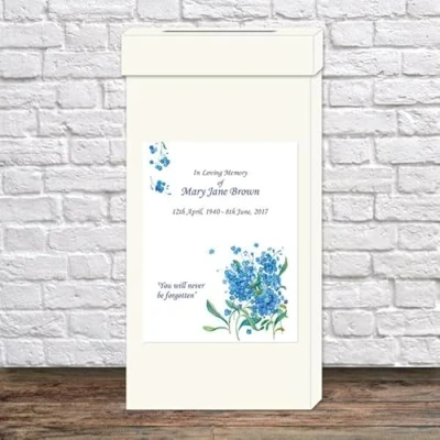 Collect sympathy cards, attendance cards, or charity donations at a funeral service using this tasteful post box. Blue forget me not flowers add a beautiful bit of colour to the accessory. You can fully personalise the wording to suit your needs. HIGH QUALITY: These cards are printed onto high quality 350gsm matte white card. Supplied flat-packed. Simple self-assembly is required. Post box measurements: 25cm x 25cm x 50cm. Lid slot measurements: 21cm x 4cm. MADE WITH LOVE IN THE UK - Here at dotty about paper, our stationery is designed, printed, and hand-packed with love in the UK! All of our customer service is also handled in house in the UK - we are always happy to help! SUSTAINABLE - We are involved in a number of Woodland Creation and Peatland Restoration projects that offset the carbon created in our processes in an effort to benefit the country, the landscape and the global environment. All projects are certified to the Woodland Carbon Code.