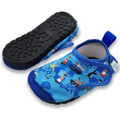 Non-Slip Water Shoes: Durable rubber sole grips wet surfaces—ideal for swimming pools, slippery stones, and hot sand—to keep little feet safe during all water adventures. Perfect Fit & Barefoot Feel: Available in EU sizes 20–33, these swim shoes offer a true barefoot-style experience—supporting natural foot movement and muscle development in growing feet. Secure Hook-and-Loop Fastening & Fast-Drying Upper: 100% polyester knit dries quickly between dips, while the adjustable hook-and-loop strap and stretchy Lycra trim ensure a snug, gentle fit. Charming Sea-Life Designs: Designed in England with three adorable prints—Mermaid, Blue Boat and Sea Creatures—to spark your child’s imagination at the beach or pool.