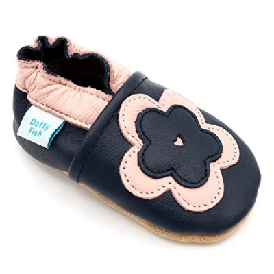 Dotty Fish Soft Leather Baby Shoes. Toddler Girls. Non Slip. Navy Shoes with Pink and Flower. 4 5 Years (10 UK Child)