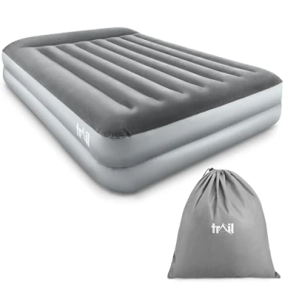 XL DOUBLE AIRBED WITH PILLOW: Give guests the luxury treatment and glamp things up when camping with this Deluxe XL Double Airbed. Raised to mimic a real mattress and extra-wide for comfort, it measures 203cm x 152cm x 46cm with a 300kg weight capacity. BUILT-IN AC PUMP FOR FAST INFLATION: Inflates in around 240 seconds with the built-in AC pump and UK mains plug. Designed with internal cord storage to keep the plug hidden, plus a secondary valve for manual inflation if required on camping trips. STRENGTH, SUPPORT & COMFORT: Made from tough Tritech material an internal I-Beam design for strength, support, and comfort. Soft flocked surface treated with Ultra-Fresh which is non-slip, waterproof, and resistant to odours, mould, and mildew. COMPACT BAG FOR STORAGE & TRANSPORT: Supplied with a heavy-duty drawcord carry bag to easily store and carry on outdoor adventures. Packed inside, the double airbed measures L39cm x W35cm x H18cm (approx.) and weighs just 6.9kg. SOFTENING IS NORMAL: Airbed may soften after inflation due to material stretch, air temperature, or changes in air pressure. This shouldn’t be mistaken for a leak. If you notice a drop in firmness, simply top it up with air for optimal support and comfort.