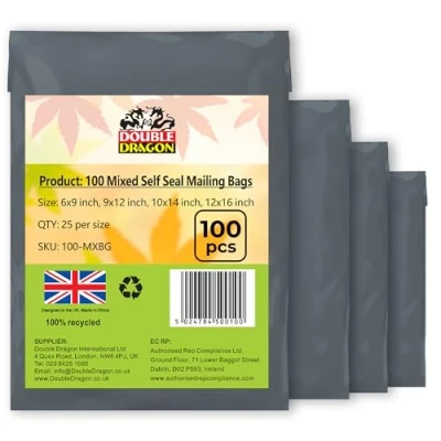 ✅ 100-PACK ASSORTED MAILER BAGS: Includes 100 grey self-seal poly mailers in 4 popular sizes – 4x9", 9x12", 10x14", and 12x16" (25 of each). A bulk value pack that covers all your shipping and packaging needs. ✅ DURABLE & TEAR-RESISTANT: Made from premium-grade polythene, these mailing bags are puncture-proof, stretch-resistant, and tough enough to withstand rough handling during shipping. ✅ WATERPROOF & SECURE: Designed to be waterproof and tamper-resistant, protecting your parcels from rain, spills, dirt, and unauthorized access, ensuring items arrive safe and clean. ✅ SELF-SEAL CLOSURE: Each bag features a strong peel-and-seal adhesive strip, providing a quick, tamper-proof closure. No extra tape required for a secure seal that saves time and effort. ✅ MULTI-SIZE CONVENIENCE: With 4 different sizes in one pack, these mailing bags are perfect for clothes, books, accessories, documents, electronics, and more. A versatile solution for both home and business shipping. ✅ DOUBLE DRAGON RELIABILITY: Backed by Double Dragon’s trusted quality, these lightweight yet strong poly mailer bags combine professional presentation with reliable protection—ideal for e-commerce sellers, warehouses, and households.