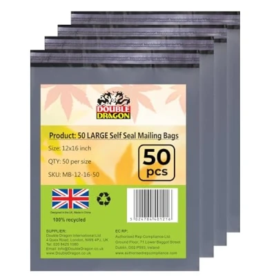 ✅ 50-PACK LARGE POLY MAILER BAGS:Pack of 50, 12x16 inches (305 x 406 mm). The extra large bags are 60 microns thick to provide an extra layer of protection ✅ EXTRA-STRONG POLYTHENE: Crafted from 60-micron premium polythene, these oversized mailing bags are tear-resistant, ensuring durable protection for larger parcels without compromising flexibility. ✅ WATERPROOF & TAMPER-PROOF: These large poly mailer bags are designed to protect against rain, spills, dirt, and tampering, ensuring safe transit even in harsh conditions. ✅ SELF-SEAL CLOSURE: Equipped with a strong peel-and-seal adhesive strip, these strong shipping bags ensure a quick, tamper-proof seal. No extra tape or glue required. ✅ VERSATILE OVERSIZED MAILING BAGS: Ideal for shipping clothes, blankets, bedding, electronics, documents, and more. Lightweight yet tough, these poly mailers reduce postage costs while providing maximum security. Can also be used for storage or organizing items. ✅ DOUBLE DRAGON RELIABILITY: Trusted for strength and durability, Double Dragon large mailing bags combine security, toughness, and professional quality, making them the smart choice for all shipping needs., Weight: 1.3889122506 Pounds, Manufacturer: Double Dragon