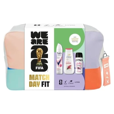 Give your squad the perfect gift to prepare for a season of football with the Match Day Fit Gift Set, featuring our freshest line up: an advanced body wash and anti-perspirant, plus a body spray The Lynx Attract for Her Body Spray with dual-action odour-busting zinc technology gives her 48 hours of odour protection, keeping her feeling confident and smelling sweet, all day Dove Advanced Care Reviving Body Wash will energise and revive dull skin after just one shower while awakening her senses with an invigorating pomegranate and hibiscus fragrance Sure Women Nonstop Protection Bright Bouquet Anti-Perspirant Aerosol Deodorant provides 72-hour odour and sweat protection, to keep her moving all day Featuring a match ready washbag with striking multicoloured design, this gift set will help her get all the essentials ready for the big game Get Match Ready and celebrate the FIFA World Cup 2026 with our gift collection. As proud official sponsor