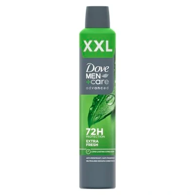 Dove Men+Care Advanced Extra Fresh XXL Anti-Perspirant Aerosol Deodorant provides 72 hour protection against sweat and odour This deodorant spray offers advanced care and an extremely fresh scent, for long-lasting protection and confidence The improved formula of our antiperspirant spray features Triple Action technology which gives you advanced, complete protection throughout the day The aerosol spray contains 1/4 moisturising cream for protection that's tough on sweat but not on your skin This deodorant for men features our long-lasting citrus scent to leave you and your underarms smelling good all day long and beyond Globally, Dove deodorant is not tested on animals, with our products being certified as cruelty-free and PETA approved vegan.