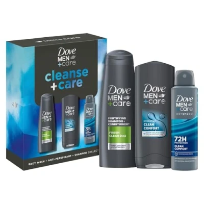 Dove Men+Care Gift Set Cleanse+Care Trio Bodywash 250ml, Antiperspirant 150ml, 2 in 1 Fresh Clean Shampoo 250ml Grooming Essentials Kit for Men with Comfort Scent