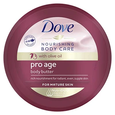 Dove Pro age nourishing body care body Butter contains olive oil and vitamin B3 for natural skin rejuvenation Body moisturiser that is enriched with nutriduo, to nourish the deeper* layers of the skin Lotion leaves skin moisturised and soft for 24 hours Dove Body Butter improves the appearance of dark spots, accelerates cell renewal, and helps to prevent dry skin Dove Body Lotion revitalises mature skin allowing it to restore itself naturally