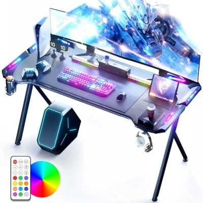 This Dowinx gaming desk is built like a tank, mate! It's got a rock-solid frame with a clever multi-triangle structure and double ground supports, so it can handle anything you throw at it. We've even beefed up the tubing – it's a whopping 20% thicker than the competition's, so you won't find a sturdier desk anywhere. And get a load of these LEDs! Four armour-shaped lights with a blinding 7 colours and 384 different modes. Control 'em all with the handy remote – it's like a bloody disco for your desktop! We've even used top-notch lamp beads with thicker filaments, so they'll last longer and shine brighter than a thousand suns. Now, this desk is massive! With a 47x23.6 inch tabletop, you can fit a monitor the size of a telly on it, no problem. It's covered in this swanky carbon fibre texture, which not only looks the business but also makes it scratch-proof, slip-proof, waterproof, and a doddle to clean. We've really thought about your comfort, too. The tabletop's got a slight curve to it, so you can game for hours without your wrists getting knackered. And there's loads of legroom underneath, so you can stretch out like a lord. It even comes with all the bits and bobs you need for everyday use. Assembling this bad boy is a piece of cake. You'll have it up and running in 20-30 minutes, no sweat. We even chuck in all the tools and instructions. And if you do have any bother, our crack team of customer service agents are on hand 24/7. Plus, you get a one-month replacement service and a 2-year warranty, just for peace of mind. Sorted!"
