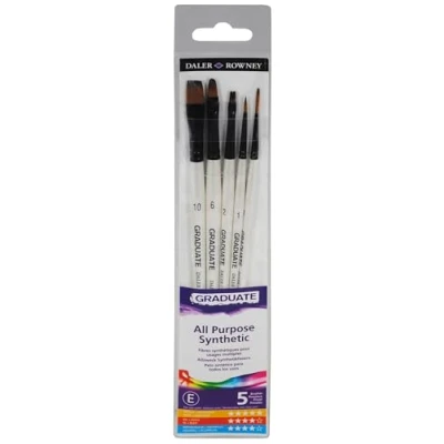 5 Graduate synthetic, short handled brush assortment, ideal for all painting techniques. Soft synthetic filaments which are resilient and durable. Ergonomic, balanced short handles for great comfort. Handmade in the Dominican Republic. Contains: Flat Shader 2 and 10, Round 1, Filbert 6 and Liner 1. Contents may vary.