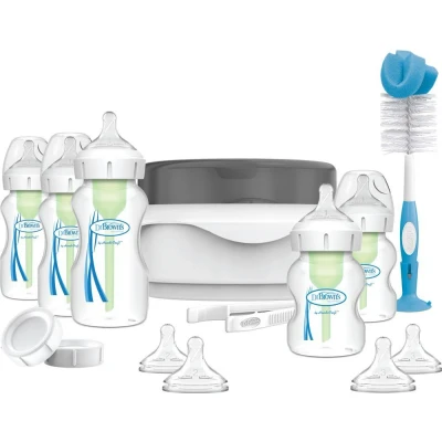 CurrysHelp your baby grow up big and strong with Dr Brown's baby bottle and steriliser kit. The vacuum-free ventilation system in the bottles helps to prevent your little one suffering from windy colic. Use the microwave steriliser to make sure you always have bottles ready for your babys next feed as it can handle up to 4 bottles at once. And the set comes with a whole host of different teats and bottles - perfect for your baby's changing feeding needs. Good to know - Using these bottles help to improve their digestion so both babe and you can sleep soundly- You can start using these from birth as they're suitable for newborns - The teat has been specifically designed so your baby can easily latch on and have a more natural experience - Cleaning it is super easy with its bottle and vent cleaning brushes