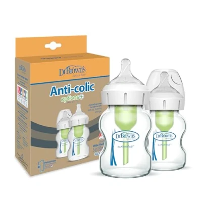 AmazonANTI-COLIC GLASS BABY BOTTLE. Anti-Colic internal vent system is clinically proven to reduce colic. Decreases spit-up, burping and wind. CONSISTENT FLOW RATE. Vacuum-free feeding is closest to breastfeeding and Dr. Brown’s silicone teats provide a consistent flow so babies can feed at their own pace PRESERVES NUTRIENTS. The anti-colic vent system is proven to help preserve bottle milk nutrients and aids in digestion for a better night’s sleep. BREASTFEEDING BOTTLE. The breast-like teat shape encourages a proper latch for a more natural bottle feeding experience and eases the transition from breast to bottle and back again. BOTTLE GROWS WITH BABY. Dr. Brown’s Natural Flow Anti-Colic Options+ baby bottle works best with the internal vent system in place but can be removed as baby’s feeding develops – no need to introduce a different bottle.