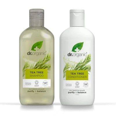 Dr Organic Tea Tree Shampoo & Conditioner Set with Travel Bag, Purifying, Oily Roots Natural, Vegan, Cruelty Free, Paraben SLS Recyclable Recycled Ocean Bound Plastic, Organic, 265ml