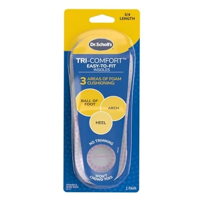 ALL-DAY CUSHIONING: Enjoy long-lasting comfort for your heel, arch, and ball of foot with soft foam cushioning and flexible arch support that helps distribute foot pressure while keeping your feet feeling great throughout daily activities each day TARGETED PRESSURE RELIEF: Soft foam cushioning works with flexible arch support to distribute foot pressure across the ball of foot, arch, and heel, delivering added comfort that helps your feet feel great and supported during daily movement without crowding your toes EASY FIT & STAY-PUT DESIGN: The simple 3/4 length removable insole requires no trimming, fits well in most shoes, and features an adhesive back that helps keep it securely in place, giving you convenient, reliable comfort and support throughout the day SCIENTIFICALLY ENGINEERED SUPPORT: Scientifically engineered contouring gently hugs the foot to deliver exceptional comfort with targeted cushioning for the heel, arch, and ball of foot, helping ease discomfort as you move through your daily routine with lasting support LONG-LASTING COMFORT: Designed to last up to 12 months, these insoles provide long-lasting cushioning and flexible arch support for the heel, arch, and ball of foot, offering reliable comfort and stability that helps your feet feel great day after day