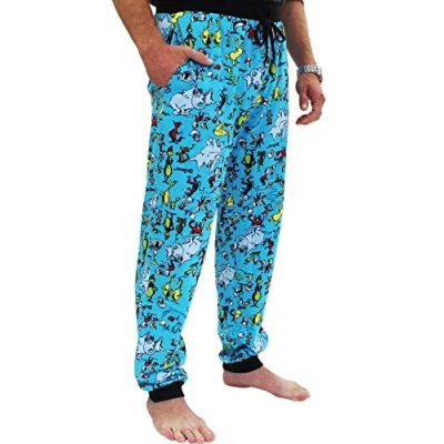 GET COMFORTABLE - Relax after a day at work or school in these Dr. Seuss Jogger Lounge Pants! These fun pajamas are available in men's sizes X-Small, Small, Medium, Large, X-Large, and XX-Large. FEATURING DR. SEUSS GRAPHICS - These pajama bottoms feature fun sublimated graphics of your favorite holiday characters from the Dr. Seuss library: The Grinch, Cat in the Hat, Horton, Thing 1 and Thing 2, and more! These men's joggers are great for sleeping or lounging after a long day at work. QUALITY MATERIALS - These Dr. Seuss pajama pants are made from high-quality soft 100% cotton fabric. Each jogger contains double stitched hems and an elastic waist with adjustable drawstring. THE PERFECT GIFT! - Men's Dr. Seuss pajama pants make the perfect Birthday, Anniversary, or Christmas gift for your sweetheart. Why? They are comfortable, fun, and very affordable. Get your own pair, or buy one for a friend! PRODUCT CARE - Caring for these pajamas is easy. Wash them in cold water. These pajama pants are imported.
