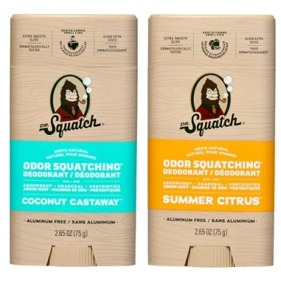 GIVE B.O. THE BOOT - 2-pack deodorant men love, with powerful natural protection of our Odor-SquatchingTM formula. Smell great in our Summer Citrus (Bright and energizing, like a lemonade on a summer day) & Coconut Castaway (Better than a beachside piña colada? Maybe) ATTACK STINK AT THE SOURCE - Men's Deodorant with natural ingredients like Arrowroot Powder, Charcoal, and Postbiotics for powerful natural protection and all-day confidence. NO HARMFUL INGREDIENTS - Our aluminum free deodorant is 98-100% natural in origin, and we never use harsh chemicals that are brutal on your skin. Made with naturally-derived fragrances - Nature smells awesome, so should you. That’s why we only use naturally-derived scents and avoid fragrances that smell like a middle school locker room. DOC’S NOTES - Swipe those pits 3-4 times post shower for all-day freshness and confidence. FORMULATED FOR MEN - You’ve got needs and we’ve got the goods. We develop our high-performance natural products specifically for the needs of men.