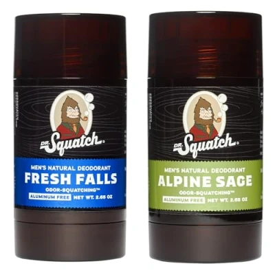 GIVE B.O. THE BOOT - 2-pack deodorant men love, with powerful natural protection of our Odor-SquatchingTM formula. Smell great in our Alpine Sage (A breezy and warm mix of cypress, patchouli and sage) & Fresh Falls (Refreshing and clean with a hint of citrus) ATTACK STINK AT THE SOURCE - Men's Deodorant with natural ingredients like Arrowroot Powder, Charcoal, and Postbiotics for powerful natural protection and all-day confidence. NO HARMFUL INGREDIENTS - Our aluminum free deodorant is 98-100% natural in origin, and we never use harsh chemicals that are brutal on your skin. Made with naturally-derived fragrances - Nature smells awesome, so should you. That’s why we only use naturally-derived scents and avoid fragrances that smell like a middle school locker room. DOC’S NOTES - Swipe those pits 3-4 times post shower for all-day freshness and confidence. FORMULATED FOR MEN - You’ve got needs and we’ve got the goods. We develop our high-performance natural products specifically for the needs of men.