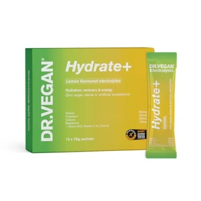DR.VEGAN Hydrate+ Hydration Sachets, Zero Sugar Electrolyte Powder Informed Sport Rehydration Sachet with No Artificial Preservatives Full Spectrum Electrolytes (15 Lemon)