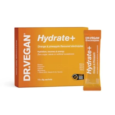 DELICIOUS ORANGE & PINEAPPLE: Bursting with natural orange and pineapple flavour, these sachets offer a tropical, revitalising taste without any sugar or artificial sweeteners. Made with real fruit extracts, this flavour is ideal for staying hydrated throughout the day. Whether you’re heading to the gym, recovering after a workout, or just looking to boost your daily water intake, this refreshing blend helps you rehydrate quickly and deliciously. FULL SPECTRUM ELECTROLYTE REPLENISHMENT: Every sachet is scientifically formulated with a precise balance of key electrolytes; 600mg sodium, 250mg potassium,150mg magnesium and 250mg calcium. These essential minerals work together to support optimal hydration, aid muscle function, combat fatigue and cramping. Whether you’re active, travelling or feeling run down, these electrolytes help you recover faster and feel energised. ENERGY, FOCUS & IMMUNITY SUPPORT: In addition to hydration, each sachet includes powerful nutrients to support your body and mind. With 300mg of Vitamin C, 300µg of Vitamin B12 and 300 mg of L‑Taurine per sachet, Hydrate+ helps boost your immune defences, enhance energy levels and support mental clarity. It’s a smarter hydration choice for those who want more than just water. 100% VEGAN, ALLERGY-FREE & GUT FRIENDLY: Made with clean, sustainable ingredients, DR.VEGAN Hydrate+ is suitable for all diets. It's 100% vegan, non-GMO, gluten-free and free from dairy, soy, stevia, and artificial sweeteners. With no unnecessary fillers or synthetic additives, it’s kind to your gut, easy to digest and perfect for daily use. Designed by nutritionists and backed by science, it’s hydration you can trust. CONVENIENT, ON-THE-GO HYDRATION: Each box contains 15 easy-to-use sachets per flavour. Simply mix with water for instant, delicious hydration wherever you are. Perfect for busy lifestyles, travelling, commuting, or keeping in your gym bag, Hydrate+ helps you stay energised and balanced throughout the day. No bulky bottles or mess – just clean, effective hydration in seconds.