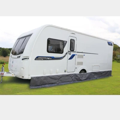Two zipped storage areas Two additional storage pockets Eyelets to allow secure pegging Suitable for caravans up to 6-metres in length Storage bag included Fabric: Dual layered PVC backing / Cotton style soft touch front Suitable for caravans up to six-metres Can be cut down to size Dimensions: L580 x H50cm Packed size: L57 x W9 x H17cm Weight: 1.6 kg