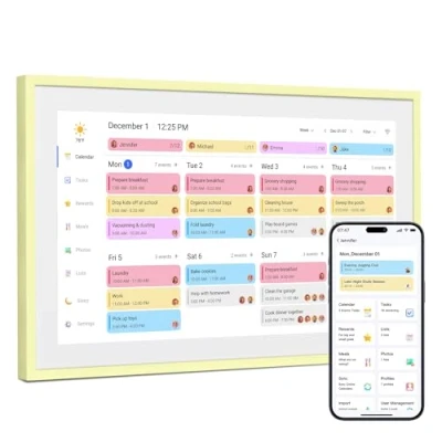15-Inch Yellow Electronic Calendar for Modern Home Decor: As an extended version of Dragon Touch's black-and-white calendar, its bright honey yellow hue perfectly matches modern-style interiors. It decorates your living room or kitchen beautifully while serving as a professional electronic family planner to organize daily schedules Instant Sync with Multiple Phone Calendars: Connect to Wi-Fi and sync instantly with Google, Apple, Outlook, Yahoo, and Cozi. One device can bind all family members' accounts simultaneously, enabling shared schedule management and real-time synchronization of everyone's plans Chore Chart & Reward System for Kids: Collaborate with children to create household chore plans, boosting their initiative at home. Corresponding rewards for completed tasks help foster their independence and sense of responsibility in a fun way 32GB Built-In Memory for Photo Sharing: Equipped with 32GB of internal storage, it can store a large number of photos. Choose between slideshow or single-image display modes for versatile presentation. Update photos dynamically anytime to interact with family and build closer bonds with loved ones Dual Display Options: Tabletop & Wall-Mounted: Beyond placing it on coffee tables, this electronic calendar can be easily mounted on walls. We provide professional installation accessories, making the setup process simple and hassle-free