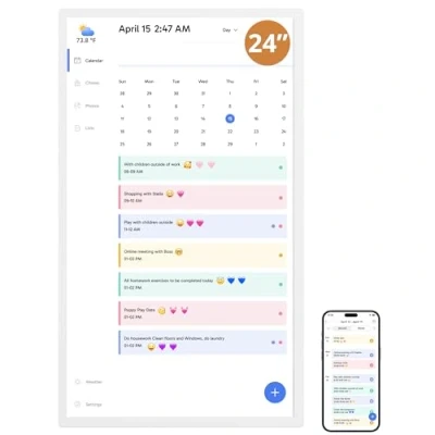 24-Inch Family Planner: This all-in-one Dragon Touch digital calendar can record your family members' travel and appointment arrangements, especially suitable for use in busier families, You can also record a chore chart and then complete it with your child to foster a sense of responsibility, Alternatively you can plan a weeks worth of meal plans ahead of time, including daily to-do lists that can be recorded in an electronic calendar Instant Sync with Multiple Phone Calendars: Connect to Wi-Fi and sync instantly with Google, Apple, Outlook, Yahoo, and Cozi. One device can bind all family members' accounts simultaneously, enabling shared schedule management and real-time synchronization of everyone's plans Chore Chart & Reward System for Kids: Collaborate with children to create household chore plans, boosting their initiative at home. Corresponding rewards for completed tasks help foster their independence and sense of responsibility in a fun way 64GB Built-In Memory for Photo Sharing: Equipped with 64GB of internal storage, it can store a large number of photos. Choose between slideshow or single-image display modes for versatile presentation. Update photos dynamically anytime to interact with family and build closer bonds with loved ones Dual Display Options: Tabletop & Wall-Mounted: Beyond placing it on coffee tables, this electronic calendar can be easily mounted on walls. We provide professional installation accessories, making the setup process simple and hassle-free