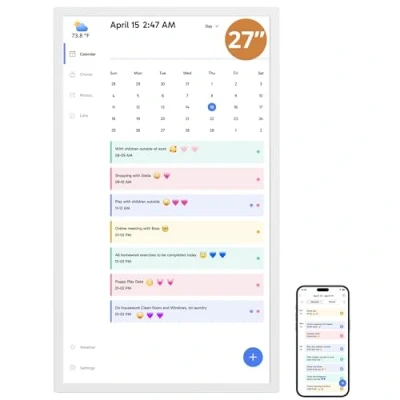 27-Inch Family Planner: This all-in-one Dragon Touch digital calendar can record your family members' travel and appointment arrangements, especially suitable for use in busier families, You can also record a chore chart and then complete it with your child to foster a sense of responsibility, Alternatively you can plan a weeks worth of meal plans ahead of time, including daily to-do lists that can be recorded in an electronic calendar Instant Sync with Multiple Phone Calendars: Connect to Wi-Fi and sync instantly with Google, Apple, Outlook, Yahoo, and Cozi. One device can bind all family members' accounts simultaneously, enabling shared schedule management and real-time synchronization of everyone's plans Chore Chart & Reward System for Kids: Collaborate with children to create household chore plans, boosting their initiative at home. Corresponding rewards for completed tasks help foster their independence and sense of responsibility in a fun way 64GB Built-In Memory for Photo Sharing: Equipped with 64GB of internal storage, it can store a large number of photos. Choose between slideshow or single-image display modes for versatile presentation. Update photos dynamically anytime to interact with family and build closer bonds with loved ones Dual Display Options: Tabletop & Wall-Mounted: Beyond placing it on coffee tables, this electronic calendar can be easily mounted on walls. We provide professional installation accessories, making the setup process simple and hassle-free