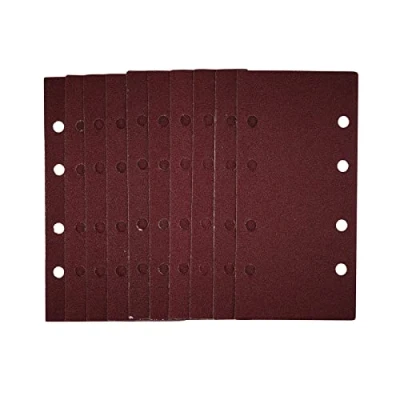 General description This pack includes 10 sheets of 1/3 size sanding paper measuring 93 x 190mm, suitable for various sanding and finishing tasks. Made from high-quality aluminium oxide resin-bonded for enhanced grain adhesion, these sheets offer anti-static properties and long-lasting performance. The heavy-duty E-Weight backing provides increased durability, allowing them to withstand tough jobs. The hook and loop backing system enables quick and easy sheet changes, while the pre-punched 8mm holes improve dust extraction. Technical specifications Dimensions: 93 x 190mm Grit: 80 Pack quantity: 10 sheets Backing type: Hook and loop Pre-punched holes: 8mm Compatibility and accessories Compatible with most 1/3 size sanders featuring hook and loop attachment systems Compatible with Stock No. 57839 Usage Ideal for sanding and finishing wood, metal, aluminium alloys, painted surfaces, plastics, and fillers