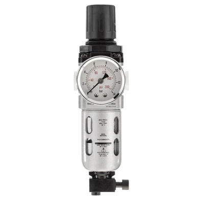 General description This is a 1/4" BSP combined filter and regulator unit designed for use in compressed air systems. It effectively removes moisture and particulates from the air flow, ensuring clean and dry air for your tools and equipment. The unit features a transparent polycarbonate bowl with a screw-on design for easy inspection and maintenance, housed in a durable aluminium casing. It includes a manual or semi-automatic drain to release accumulated moisture and a 40-micron filter for efficient filtration. Designed for professional and DIY applications requiring reliable air filtration and regulation. Technical specifications Type: Combined filter and regulator Connection size: 1/4" BSP Maximum inlet pressure: 10 bar / 145 psi Filter micron rating: 40 microns Material: Aluminium housing, polycarbonate bowl Drain: Manual or semi-automatic Compatibility and accessories Compatible with standard compressed air systems Designed to work with air tools and equipment requiring clean,