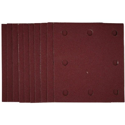General description This pack of 1/4 sanding sheets (115 x 105mm) includes 10 sheets made from premium quality aluminium oxide that is resin bonded for improved grain adhesion, anti-static qualities, and long-lasting performance. The heavy-duty E-Weight backing paper enhances durability, making these sheets suitable for the toughest jobs. The hook and loop backing allows for quick and easy changes of sanding sheets, while the eight pre-punched 8mm holes improve dust extraction, keeping your work area cleaner. Technical specifications Size: 115 x 105mm Material: Aluminium oxide Abrasive bond: Resin bonded Backing type: Hook and loop Backing weight: E-Weight Dust extraction holes: 8 x 8mm Compatibility and accessories Compatible with most 1/4 sheet sanders with hook and loop attachment systems Suitable for use with various sanding accessories designed for 115 x 105mm sheets Installation Attach the sanding sheet to your sander using the hook and loop system, ensuring it is securely