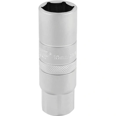 General description This high-quality 10mm spark plug socket is designed for the installation and removal of spark plugs. It features a rubber insert that protects and securely holds the spark plug during use. Made from hardened and tempered chrome vanadium steel, this socket offers exceptional durability and strength. The socket has a length of 65mm and includes a knurled ring for improved grip and handling. Technical specifications Size: 10mm Drive size: 3/8 inch Material: Chrome vanadium steel Finish: Micro satin chrome Socket length: 65mm Number of points: 6 Compatibility and accessories Compatible with 3/8 inch drive tools Suitable for standard spark plugs Installation Attach the socket to a compatible 3/8 inch drive ratchet or wrench Ensure the rubber insert is properly seated on the spark plug Usage Use to remove or install spark plugs safely and efficiently Apply steady torque to avoid damaging the spark plug or socket