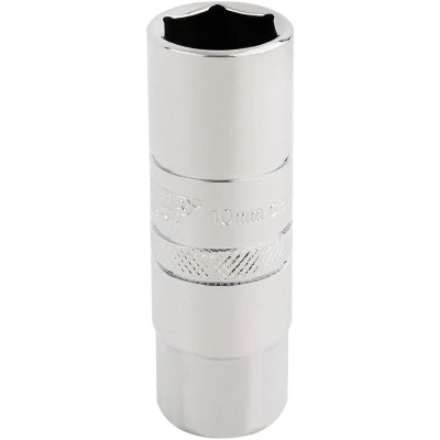 General description This is a 3/8" square drive spark plug socket designed for 10mm spark plugs. It features a 6-point deep socket head with a rubber insert to protect and securely hold the spark plug during installation or removal. The socket is made from hardened and tempered chrome vanadium steel, ensuring durability and long-lasting performance. It has a polished chrome finish for corrosion resistance and a length of 65mm. The socket includes a knurled ring for enhanced grip during use. Technical specifications Drive size: 3/8 inch Socket size: 10mm Socket type: 6-point deep socket Material: Chrome vanadium steel Finish: Polished chrome Socket length: 65mm Features: Rubber insert for plug protection and retention, knurled ring for grip Compatibility and accessories Compatible with 10mm spark plugs Designed for use with 3/8" drive ratchets and extensions Installation Attach the socket to a compatible 3/8" drive ratchet or wrench Ensure the rubber insert is properly seated on the