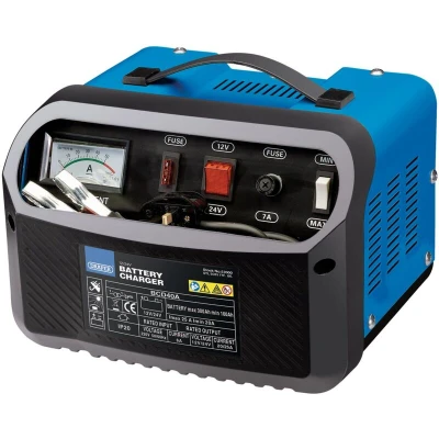 General description This battery charger is designed for workshop and home use, suitable for conventional lead acid batteries up to 300Ah. It features a compact construction with cable storage and an integrated carry handle for easy portability. The charger is supplied with insulated copper leads and battery clips for safe and efficient charging. Technical specifications Voltage: 230V AC Frequency: 50Hz Power: 660W Charge voltage: 12V/24V Charging current: 20-25A Battery capacity: 100-300Ah Dimensions: 330 x 330 x 250mm Weight: 10kg Compatibility and accessories Compatible with conventional lead acid batteries up to 300Ah Includes insulated copper leads and battery clips for connection Installation Connect the insulated copper leads to the battery terminals using the provided clips Plug the charger into a standard power outlet Usage Ensure the charger is properly connected to the battery before switching on Select the appropriate voltage setting (12V or 24V) Monitor the charging