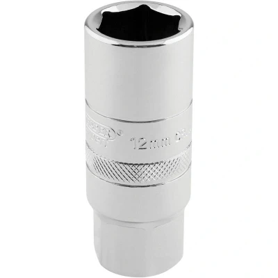 General description This is a 1/2 inch drive, 12mm spark plug socket designed for easy and secure removal or installation of spark plugs. It features a 6-point deep socket with a rubber insert to protect and retain the spark plug during use. The socket is manufactured from hardened and tempered chrome vanadium steel, ensuring durability and strength. Its polished chrome finish provides corrosion resistance and a professional appearance. Technical specifications Drive size: 1/2 inch Socket size: 12mm Socket length: 65mm Type: 6-point deep socket Material: Chrome vanadium steel Finish: Polished chrome Features: Rubber insert for plug protection and retention, knurled ring for extra grip Compatibility and accessories Compatible with 12mm spark plugs Designed for use with 1/2 inch drive ratchets or torque wrenches Installation Attach the socket to a compatible 1/2 inch drive ratchet or wrench Ensure the rubber insert is properly seated around the spark plug for protection Usage Use to