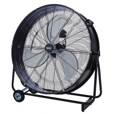 This high-velocity 30" diameter drum fan is suitable for use in industrial, commercial and leisure space environments. The fan has three speed settings and a tilt function to direct airflow. It has a heavy-duty all-metal construction and a 125W full copper motor, as well as a handle and large rubber wheels for easy manoeuvrability.