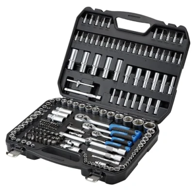 This socket and bit set is made from chrome vanadium steel with a satin chrome finish. It includes a wide range of 1/4"", 3/8"", and 1/2"" Sq. Dr. 6-point HI-TORQ sockets and deep sockets. The 72-tooth quick release ratchets are equipped with soft grip handles for comfort. The set also includes extension bars, sliding T-bar, spark plugs, universal joints, and more. Additionally, it contains a wide range of socket bits made from chrome vanadium steel with shot blasted finish. All of these items are supplied inside a sturdy plastic storage case.