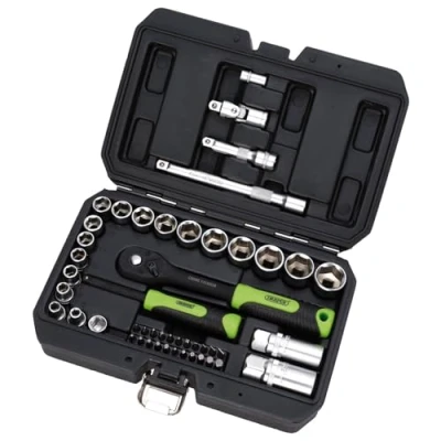 AmazonManufactured from chrome vanadium steel with satin chrome finish Seventeen 3/8" Sq. Dr. 6-point HI-TORQ sockets in sizes 6-22mm Quick release 3/8" Sq. Dr. 72-tooth ratchet and 1/4" Sq. Dr. spinner handle with soft grip handle Includes a range of hex bits, extension bars (75, 150mm), spark plug sockets (16, 21mm), universal joint and drive adaptors Supplied inside a sturdy plastic storage case Draper lifetime warranty, Weight: 5.2139324963 pounds, Manufacturer: Draper