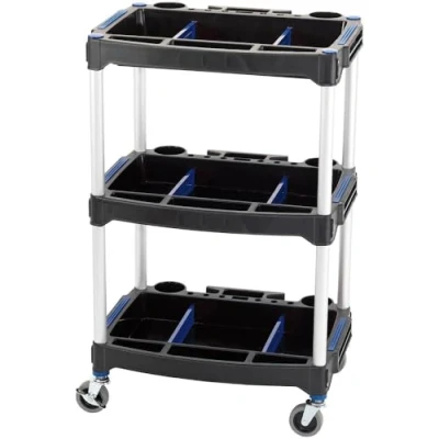 General description This 3-tier workshop trolley is designed for heavy-duty mobile storage of tools and equipment. It features durable plastic shelves supported by aluminum uprights, ensuring both strength and stability. The trolley is equipped with multiple compartments and additional features for enhanced organization and convenience. Technical specifications Material: Plastic shelves with aluminum uprights Number of tiers: 3 Compartments per tier: 2 smaller compartments (120 x 260 x 40mm), 1 larger compartment (220 x 260 x 40mm) Additional features: 6 screwdriver slots, 4 extra compartments, 2 cup holders, cable tidy Wheels: 2 fixed, 2 lockable swivel castors Compatibility and accessories Designed for workshop and DIY use Includes removable dividers for compartments Installation Supplied flat-packed with assembly instructions Easy to assemble following the included booklet Usage Ideal for organizing tools, small parts, and accessories in workshops or garages Mobility allows easy