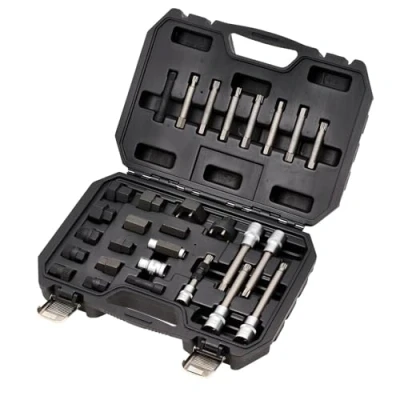 General description This 30-piece alternator pulley tool kit is designed for the removal and installation of alternator pulleys. It allows you to hold the alternator shaft securely while removing or installing pulleys, including free-wheel alternators, whether on or off the vehicle. The set is suitable for most alternators thanks to its interchangeable adapters for various brands. Technical specifications Number of pieces: 30 Material: Chrome vanadium steel Finish: Black oxide coating Compatibility and accessories Compatible with alternators from VW, Audi, Ford, BMW, Mercedes Benz, Fiat, Volvo, Mitsubishi, Honda, Toyota, Lexus, and others Includes multiple interchangeable adapters for different vehicle models Installation Use the appropriate adapter for your vehicle's alternator Secure the tool onto the alternator pulley Hold the alternator shaft steady while removing or installing the pulley Usage Designed for professional and DIY use Suitable for removing and installing alternator