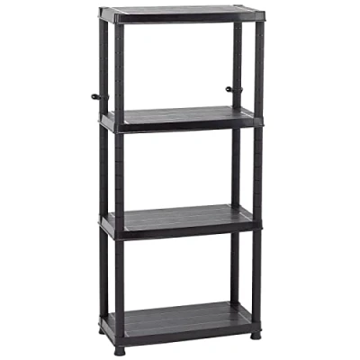 General description Easily assembled four-tier shelving unit made from robust plastic, ideal for domestic, office, garage, and workshop use. Technical specifications Dimensions: Not specified Weight capacity per shelf: 25kg (evenly distributed) Total weight capacity: 100kg Installation Supplied flat pack with wall mounting brackets for security. Usage Suitable for various environments including home, office, garage, and workshop.