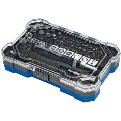 General description This 55-piece ratchet screwdriver set includes a variety of screwdriver bits, sockets, and accessories designed for versatile use in DIY and home improvement projects. The set features ergonomic handles and magnetic bit holders for ease of use and efficiency. Technical specifications Includes 25mm screwdriver bits and a 4 x 28mm precision bit set Contains 6-point Draper HI-TORQ® sockets (6-13mm) Ratchet with three positions: forward, reverse, and lock Magnetic bit holders for secure and quick bit changes Ergonomic soft grip handle for comfortable handling Compatibility and accessories Compatible with a wide range of screwdriver bits and sockets included in the set Suitable for various DIY tasks, furniture assembly, and home repairs Installation Simply select the desired bit or socket, attach it to the ratchet or handle, and use as needed Usage Use the ratchet to tighten or loosen screws and bolts efficiently Switch between forward, reverse, and lock positions for