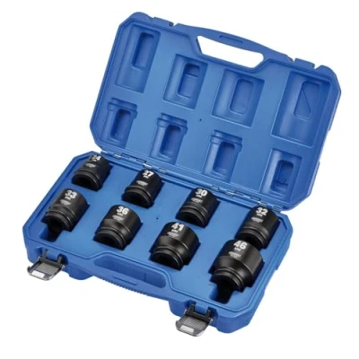 General description This 8-piece impact socket set is designed for use with 3/4" drive impact wrenches, both electric and pneumatic. Made from hardened chrome molybdenum steel, these sockets are durable and resistant to wear. They feature a black phosphate finish that provides corrosion protection. The set includes sizes 24mm, 27mm, 30mm, 32mm, 33mm, 36mm, 41mm, and 46mm, suitable for various heavy-duty applications. Each socket has a 6-point design for a secure grip on fasteners and is equipped with a ring and pin for easy attachment. Technical specifications Material: Hardened chrome molybdenum steel Finish: Black phosphate for corrosion resistance Drive size: 3/4 inch Number of pieces: 8 Socket sizes: 24mm, 27mm, 30mm, 32mm, 33mm, 36mm, 41mm, 46mm Compatibility and accessories Compatible with electric and pneumatic impact wrenches with a 3/4" drive Includes a sturdy plastic storage case with metal hinges and buckle for organization and transport Installation Insert the socket onto