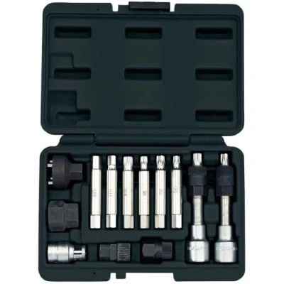 General description This is a comprehensive 13-piece alternator pulley removal tool kit designed for professional use. It allows for efficient removal of alternators and freewheels on various European car brands, whether the components are installed on or off the engine. The kit is packed in a durable blow-moulded case with a display sleeve for easy storage and transport. Technical specifications Number of pieces: 13 Includes various sockets, hex keys, and adapters for different fasteners Tools compatible with M8, M10, T40, and T50 sizes Supplied with a 1/2" square drive and a 10mm female hex adapter Compatibility and accessories Suitable for European car brands with alternators and freewheels that require specific removal tools Includes pulley connectors and a four-prong connector for versatile use Installation No specific installation steps are required; the tools are used directly on the components needing removal. Usage Use the appropriate socket or adapter to fit the fastener