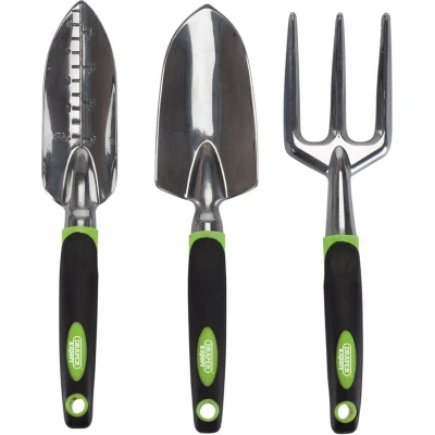 Durable garden hand tool set including a trowel, transplanting trowel and fork. All made from strong aluminium with ergonomic soft grip handles for comfort.