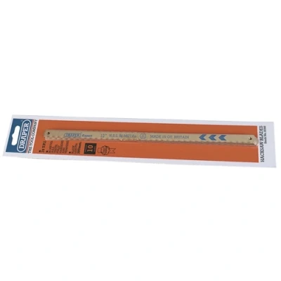 General description High-quality saw blades designed for durability and precision. Manufactured from high-speed steel strip with an electron beam welded carbon steel backing for strength and reliability. Ideal for cutting various materials with accuracy. Technical specifications Length: 300 mm Teeth per inch (TPI): 24 Material: High-speed steel strip with carbon steel backing Manufacturing process: Electron beam welding Packaging: Pack of ten blades per card Compatibility and accessories Suitable for use with compatible saw machines and tools designed for high-speed steel blades. Additional accessories are not specified. Installation Install blades securely onto compatible saw equipment following manufacturer instructions. Ensure proper alignment for safe and effective operation. Usage Use for precise cutting tasks in DIY and home improvement projects. Suitable for cutting wood, plastics, and other materials depending on saw specifications. Other information Display-packed with ten